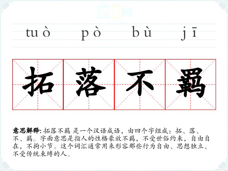 拓落不羁 是一个汉语成语,由四个字组成:拓、落、不、羁。字面意思是指人的性格豪放不羁,不受世俗约束,自由自在,不拘小节。这个词汇通常用来形容那些行为自由、思想独立、不受传统束缚的人。