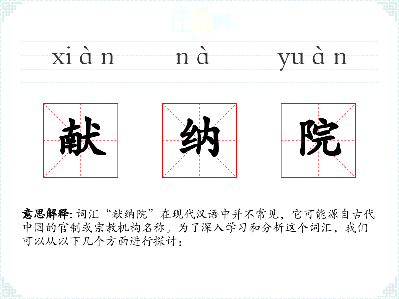 词汇“献纳院”在现代汉语中并不常见,它可能源自古代的官制或机构名称。为了深入学*和分析这个词汇,我们可以从以下几个方面进行探讨: