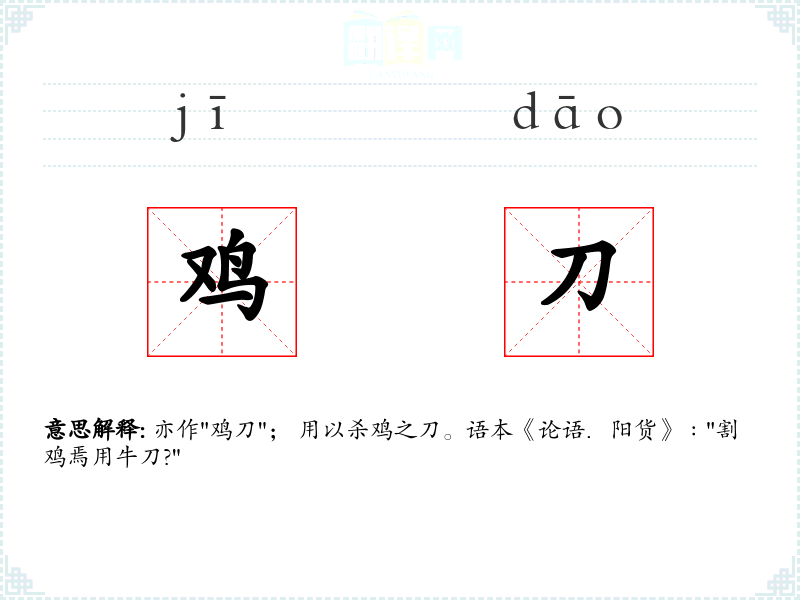 亦作"鸡刀"; 用以杀鸡之刀。语本《论语.阳货》﹕"