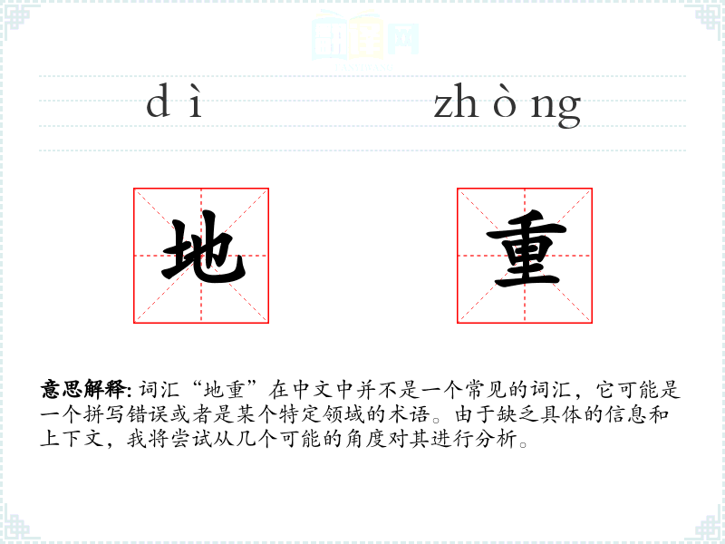 由于“地重”不是一个明确的词汇,对其的理解需要依赖于具体的上下文。在语言学习和表达中,理解词汇的准确含义和用法是非常重要的,这有助于更精确地沟通和表达思想。