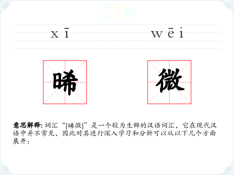 词汇“[晞微]”是一个较为生僻的汉语词汇,它在现代汉语中并不常见,因此对其进行深入学*和分析可以从以下几个方面展开: