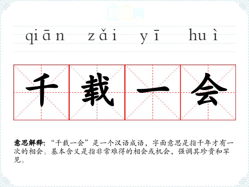 “千载一会”是一个汉语成语,字面意思是指千年才有一次的相会。基本含义是指非常难得的相会或机会,强调其珍贵和罕见。