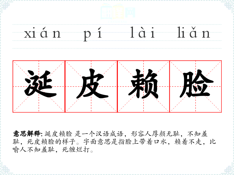 涎皮赖脸 是一个汉语成语,形容人厚颜无耻,不知羞耻,死皮赖脸的样子。字面意思是指脸上带着口水,赖着不走,比喻人不知羞耻,死缠烂打。
