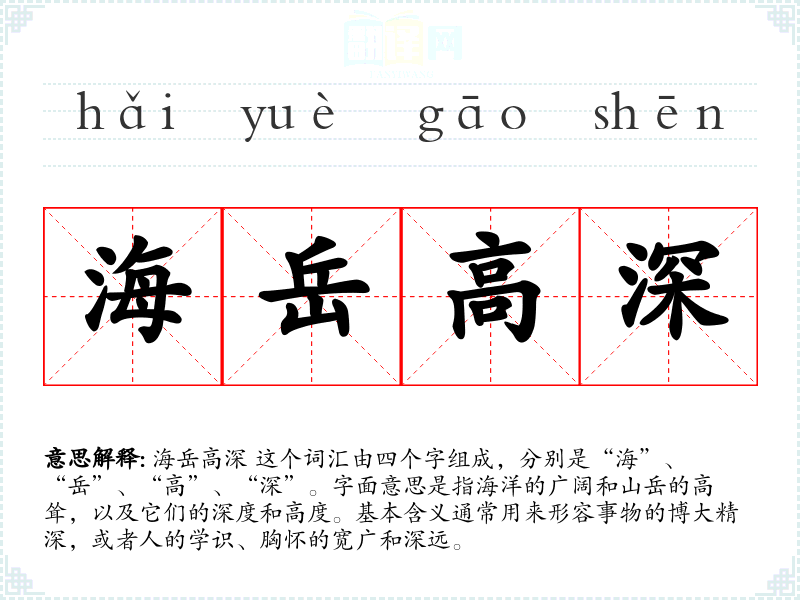 海岳高深 这个词汇由四个字组成,分别是“海”、“岳”、“高”、“深”。字面意思是指海洋的广阔和山岳的高耸,以及它们的深度和高度。基本含义通常用来形容事物的博大精深,或者人的学识、胸怀的宽广和深远。