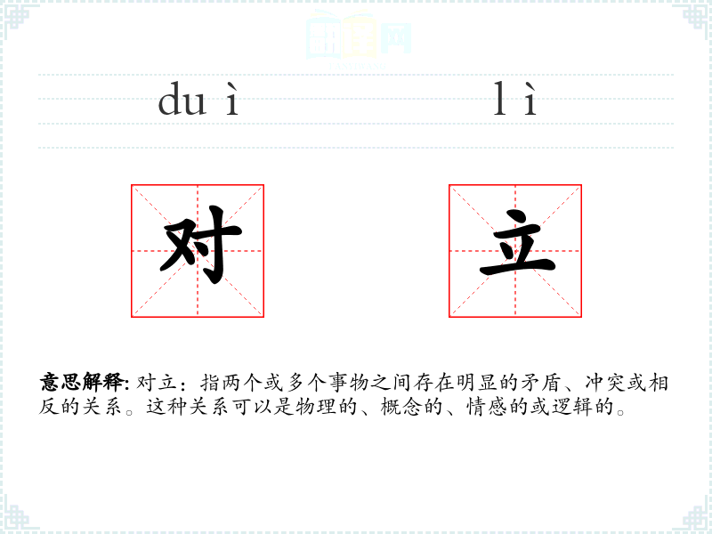 - 演变:随着语言的发展,对立的含义逐渐扩展,不仅指物理上的对抗,也包括概念和情感上的矛盾。