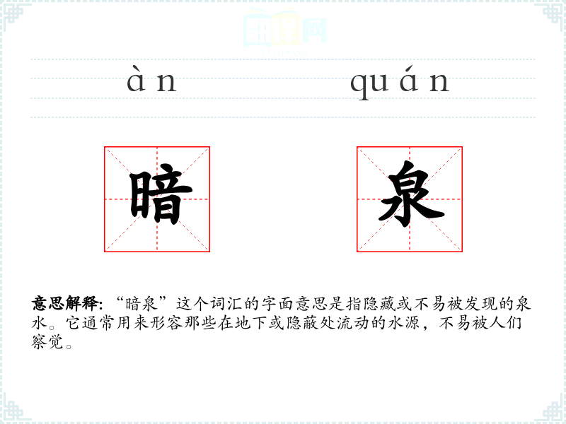 “暗泉”这个词汇的字面意思是指隐藏或不易被发现的泉水。它通常用来形容那些在地下或隐蔽处流动的水源,不易被人们察觉。