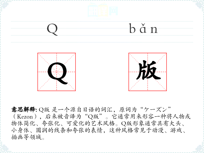 Q版 是一个源自日语的词汇,原词为“ケーズン”(Kezon),后来被音译为“Q版”。它通常用来形容一种将人物或物体简化、夸张化、可爱化的艺术风格。Q版形象通常具有大头、小身体、圆润的线条和夸张的表情,这种风格常见于动漫、游戏、插画等领域。