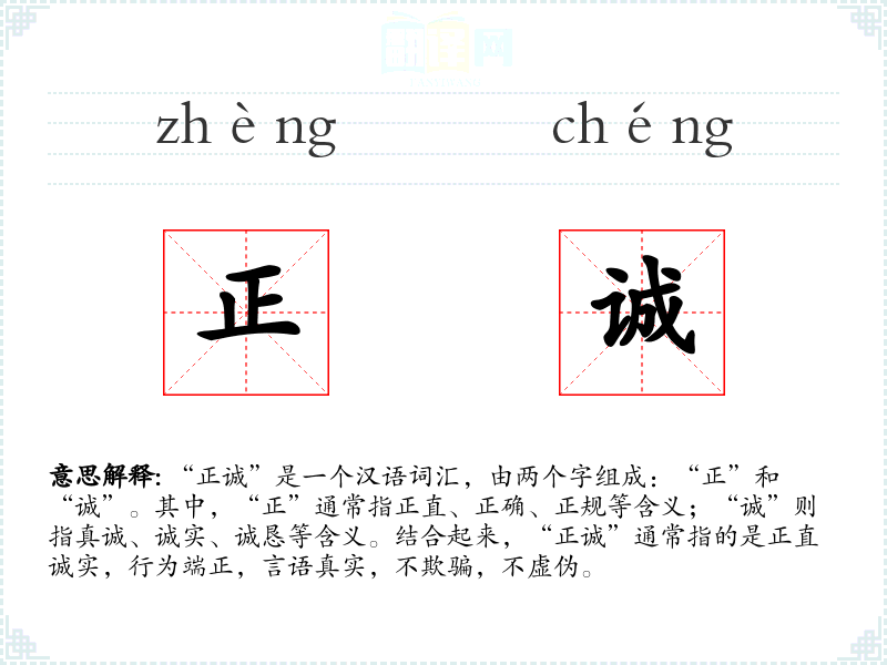 “正诚”是一个汉语词汇,由两个字组成:“正”和“诚”。其中,“正”通常指正直、正确、正规等含义;“诚”则指真诚、诚实、诚恳等含义。结合起来,“正诚”通常指的是正直诚实,行为端正,言语真实,不欺骗,不虚伪。