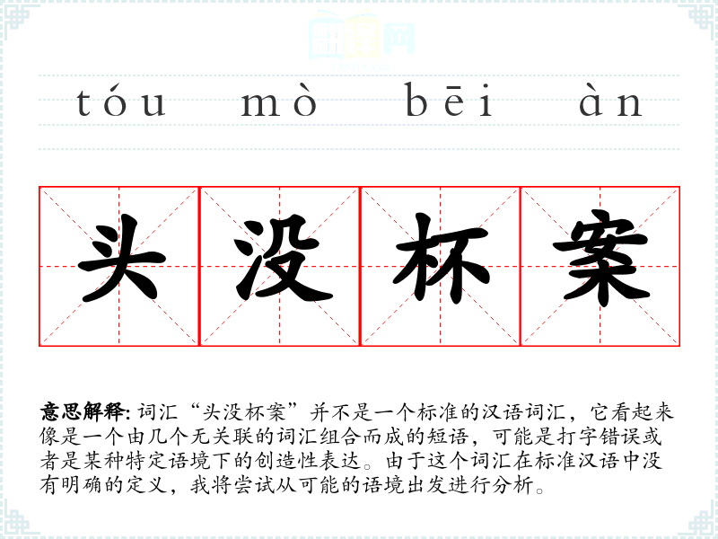 由于“头没杯案”不是一个标准词汇,我们无法给出其字面意思和基本含义。它可能是由“头”、“没”、“杯”、“案”四个字组成的短语,但这些字组合在一起并没有明确的意义。