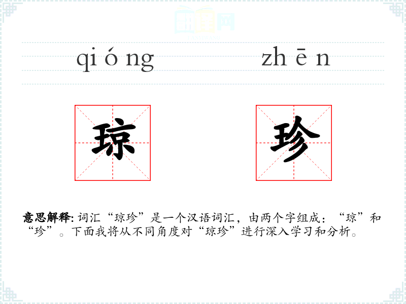 - 词源:“琼”源自古代对美玉的称呼,“珍”则源自对珍贵物品的称呼。
