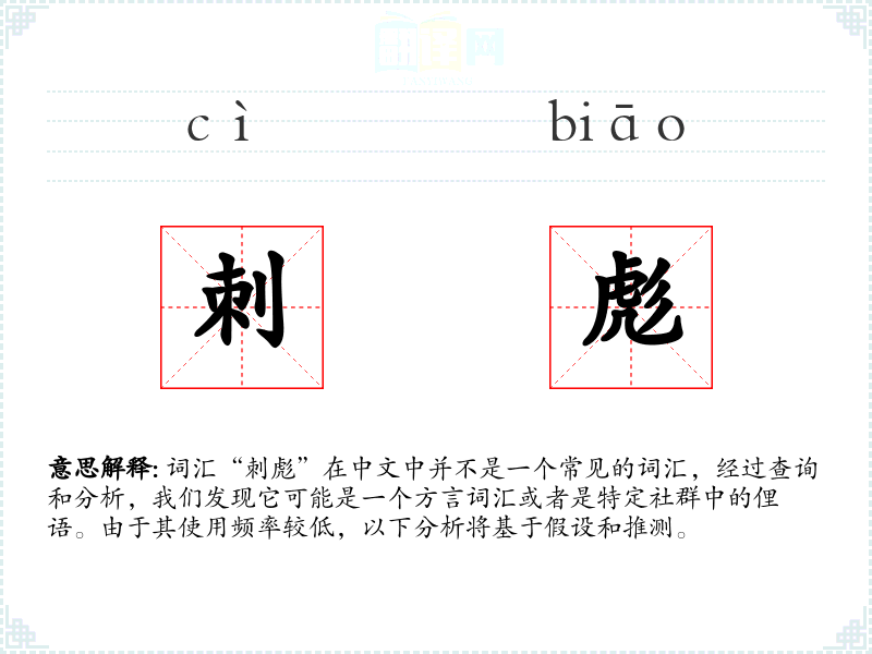 词汇“刺彪”在中文中并不是一个常见的词汇,经过查询和分析,我们发现它可能是一个方言词汇或者是特定社群中的俚语。由于其使用频率较低,以下分析将基于假设和推测。