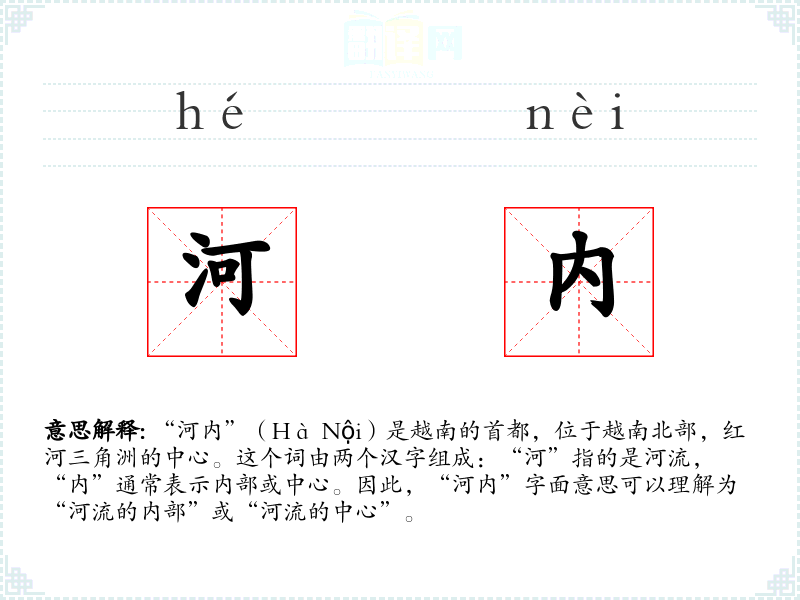 “河内”(Hà Nội)是越南的首都,位于越南北部,红河三角洲的中心。这个词由两个汉字组成:“河”指的是河流,“内”通常表示内部或中心。因此,“河内”字面意思可以理解为“河流的内部”或“河流的中心”。
