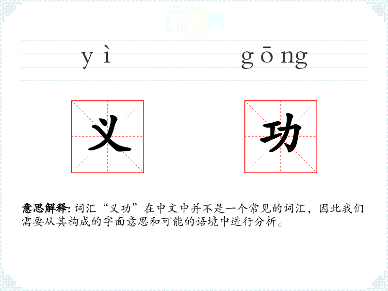 词汇“义功”在中文中并不是一个常见的词汇,因此我们需要从其构成的字面意思和可能的语境中进行分析。