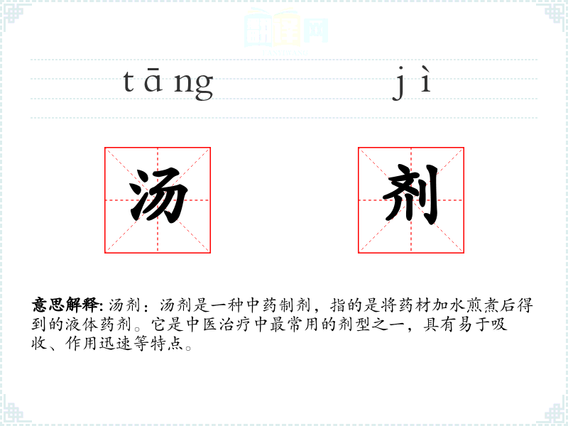 - 反义词:丸剂、散剂(这些是中药的其他剂型,与汤剂相对)