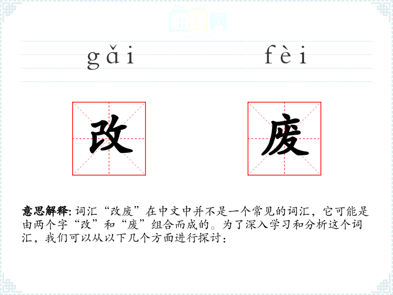 词汇“改废”在中文中并不是一个常见的词汇,它可能是由两个字“改”和“废”组合而成的。为了深入学习和分析这个词汇,我们可以从以下几个方面进行探讨: