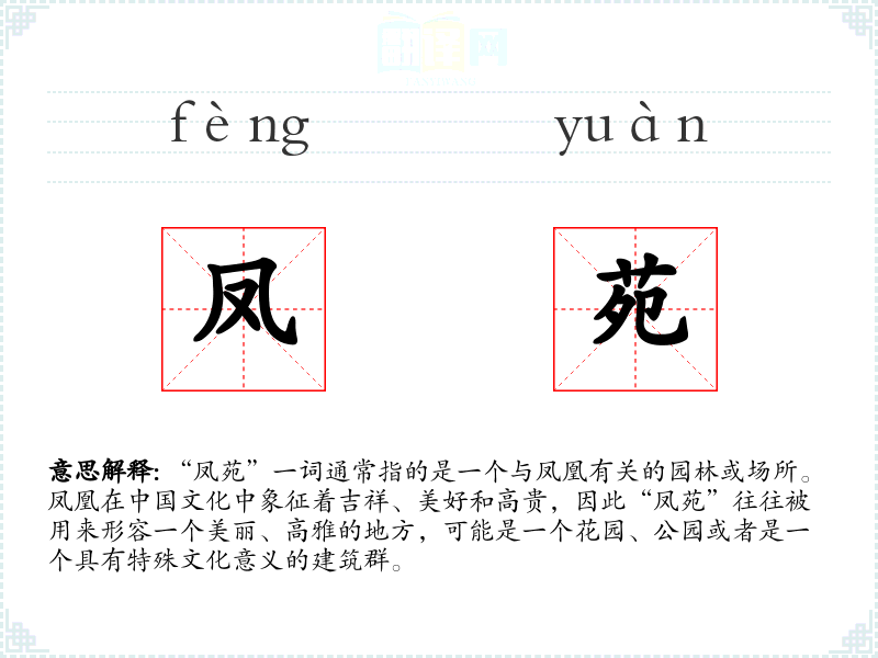 在文化中,凤凰是吉祥和美好的象征,因此“凤苑”常常与皇家的园林或贵族的私人花园联系在一起。这个词也反映了人对自然美和和谐的追求。
