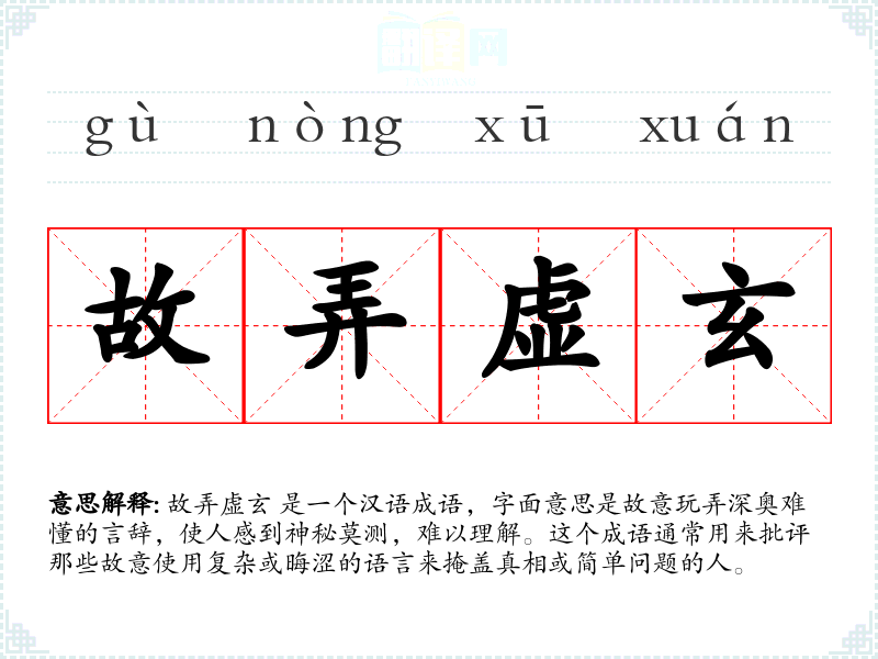 故弄虚玄 是一个汉语成语,字面意思是故意玩弄深奥难懂的言辞,使人感到神秘莫测,难以理解。这个成语通常用来批评那些故意使用复杂或晦涩的语言来掩盖真相或简单问题的人。