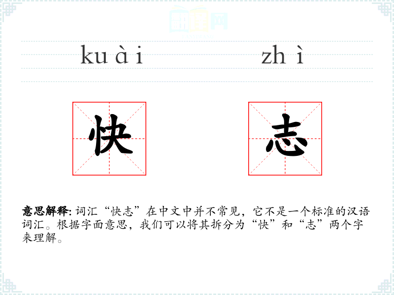词汇“快志”在中文中并不常见,它不是一个标准的汉语词汇。根据字面意思,我们可以将其拆分为“快”和“志”两个字来理解。