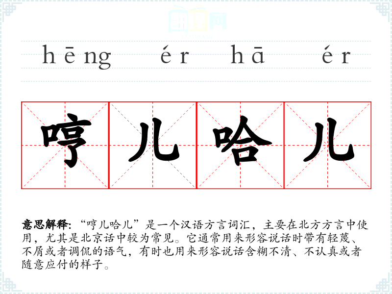 “哼儿哈儿”的具体词源不详,但它可能是由两个拟声词“哼”和“哈”组合而成,用来模拟一种不认真的说话方式。随着时间的推移,这个词逐渐被用来形容人的态度和行为。