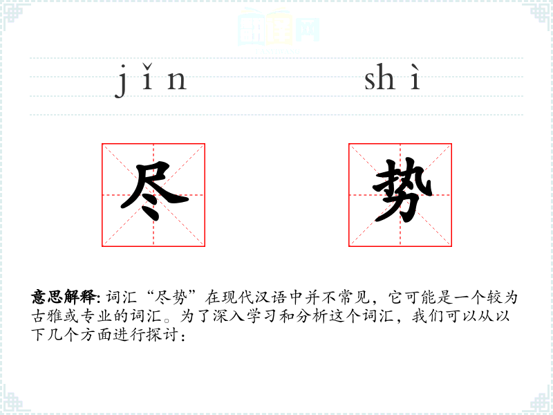 词汇“尽势”在现代汉语中并不常见,它可能是一个较为古雅或专业的词汇。为了深入学*和分析这个词汇,我们可以从以下几个方面进行探讨: