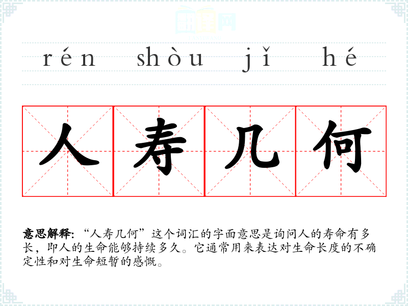 “人寿几何”这个词汇的字面意思是询问人的寿命有多长,即人的生命能够持续多久。它通常用来表达对生命长度的不确定性和对生命短暂的感慨。