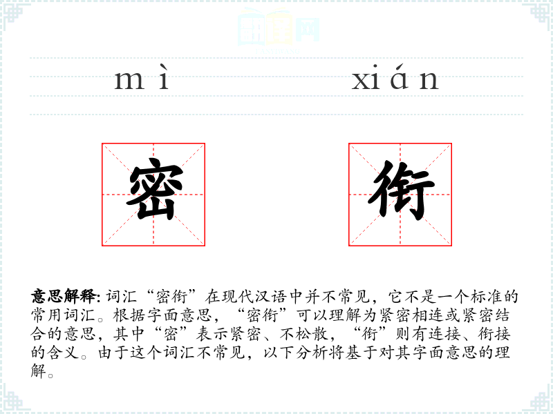 词汇“密衔”在现代汉语中并不常见,它不是一个标准的常用词汇。根据字面意思,“密衔”可以理解为紧密相连或紧密结合的意思,其中“密”表示紧密、不松散,“衔”则有连接、衔接的含义。由于这个词汇不常见,以下分析将基于对其字面意思的理解。