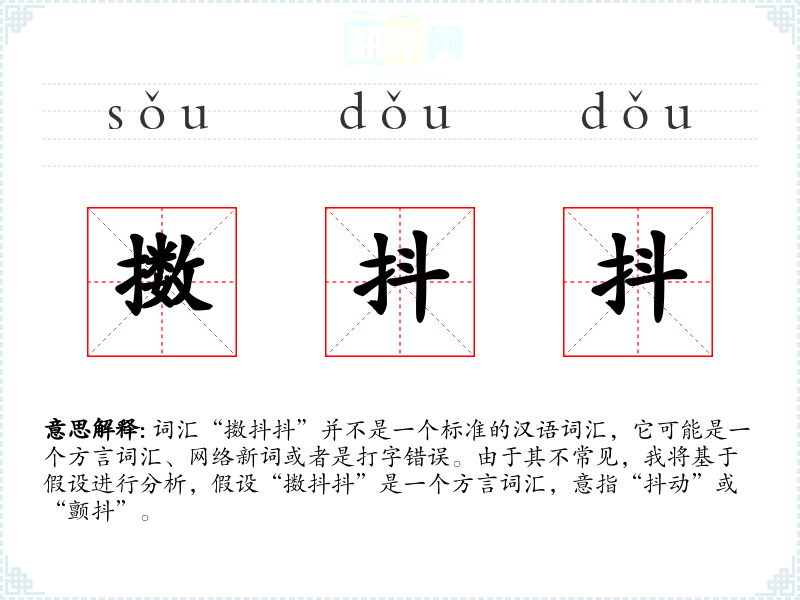 词汇“擞抖抖”并不是一个标准的汉语词汇,它可能是一个方言词汇、网络新词或者是打字错误。由于其不常见,我将基于假设进行分析,假设“擞抖抖”是一个方言词汇,意指“抖动”或“颤抖”。