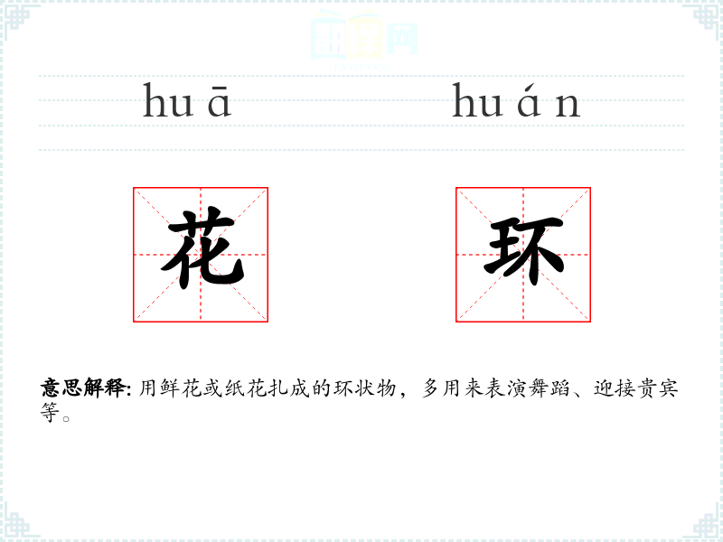 用鲜花或纸花扎成的环状物,多用来表演舞蹈、迎接贵宾等。