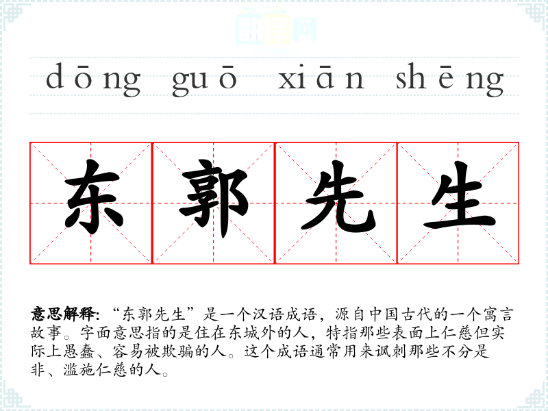 “东郭先生”是一个汉语成语,源自**古代的一个寓言故事。字面意思指的是住在东城外的人,特指那些表面上仁慈但实际上愚蠢、容易被欺骗的人。这个成语通常用来讽刺那些不分是非、滥施仁慈的人。