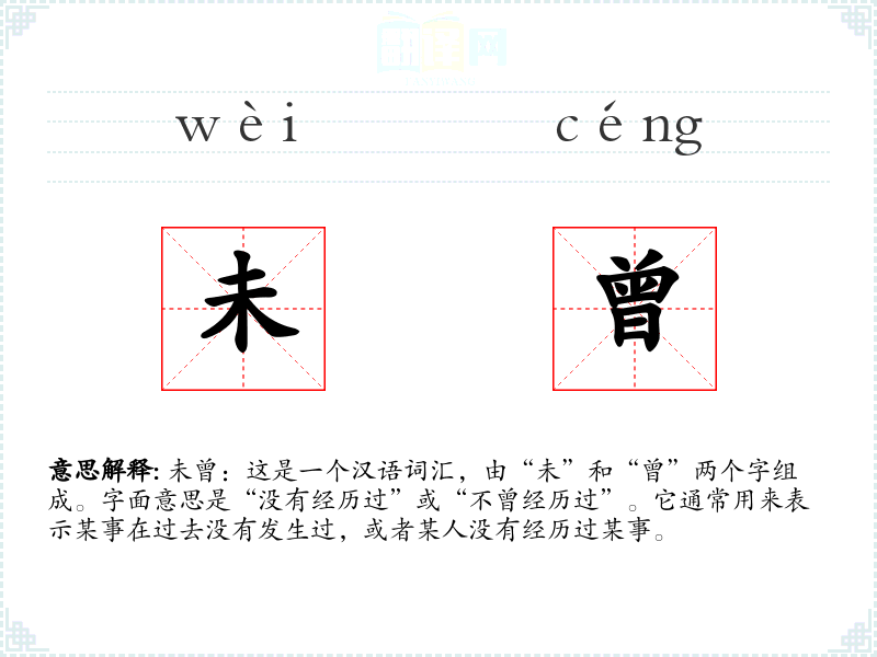 未曾:这是一个汉语词汇,由“未”和“曾”两个字组成。字面意思是“没有经历过”或“不曾经历过”。它通常用来表示某事在过去没有发生过,或者某人没有经历过某事。