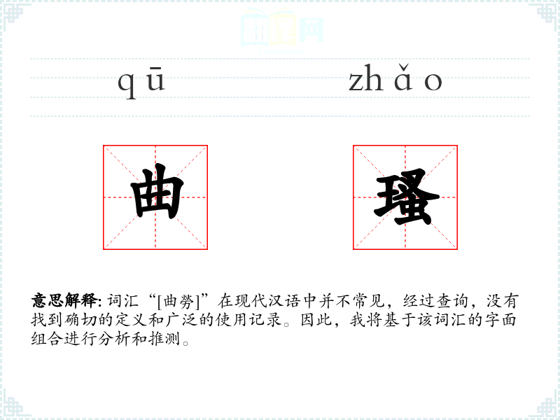 词汇“[曲勞]”在现代汉语中并不常见,经过查询,没有找到确切的定义和广泛的使用记录。因此,我将基于该词汇的字面组合进行分析和推测。