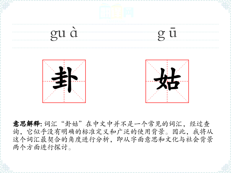 词汇“卦姑”在中文中并不是一个常见的词汇,经过查询,它似乎没有明确的标准定义和广泛的使用背景。因此,我将从这个词汇最契合的角度进行分析,即从字面意思和文化与社会背景两个方面进行探讨。