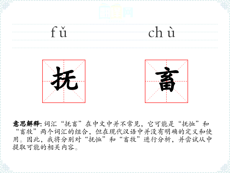 由于“抚畜”并非一个明确的词汇,以上的分析是基于“抚恤”和“畜牧”两个词汇的独立分析。在实际语言使用中,如果遇到“抚畜”这样的词汇,可能需要根据具体语境进行理解和解释。