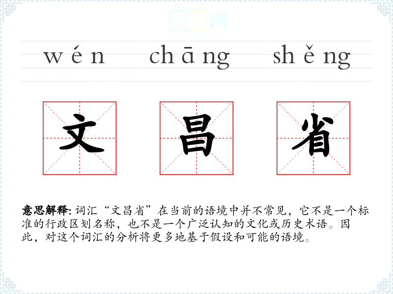 词汇“文昌省”在当前的语境中并不常见,它不是一个标准的行政区划名称,也不是一个广泛认知的文化或历史术语。因此,对这个词汇的分析将更多地基于假设和可能的语境。