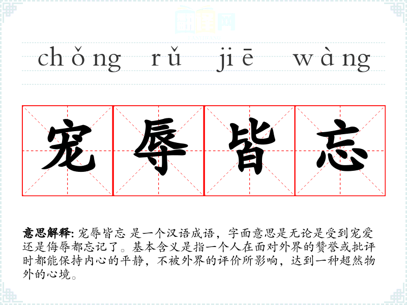 宠辱皆忘 是一个汉语成语,字面意思是无论是受到宠爱还是侮辱都忘记了。基本含义是指一个人在面对外界的赞誉或批评时都能保持内心的平静,不被外界的评价所影响,达到一种超然物外的心境。