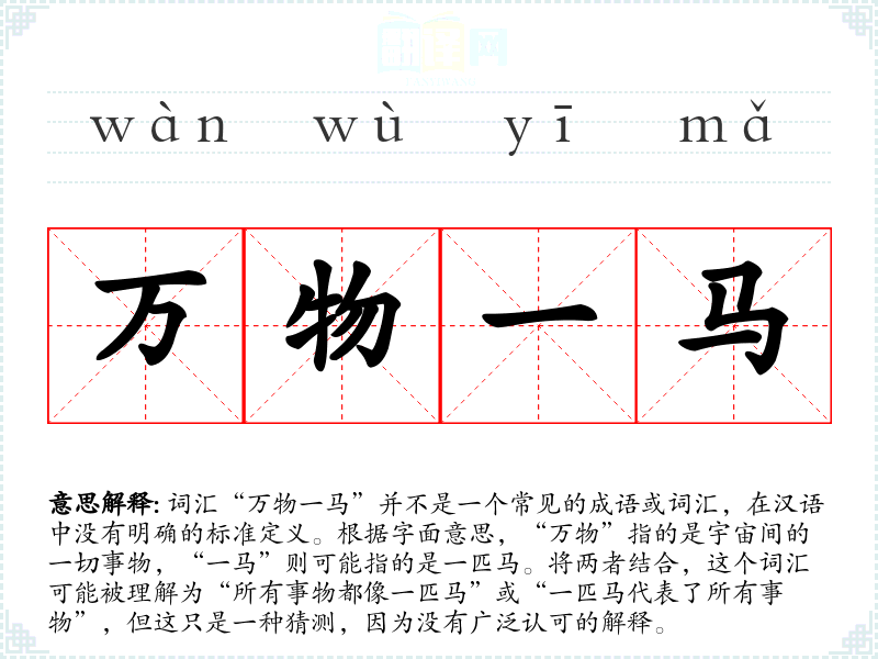 词汇“万物一马”并不是一个常见的成语或词汇,在汉语中没有明确的标准定义。根据字面意思,“万物”指的是宇宙间的一切事物,“一马”则可能指的是一匹马。将两者结合,这个词汇可能被理解为“所有事物都像一匹马”或“一匹马代表了所有事物”,但这只是一种猜测,因为没有广泛认可的解释。
