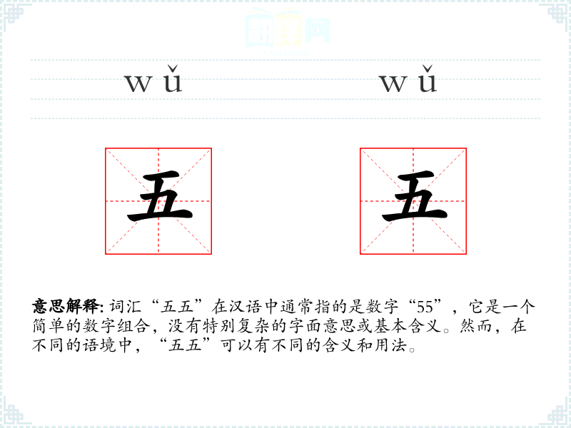 在其他语言中,如英语,“五五”可以直接翻译为“fifty-five”,用法和含义基本相同。
