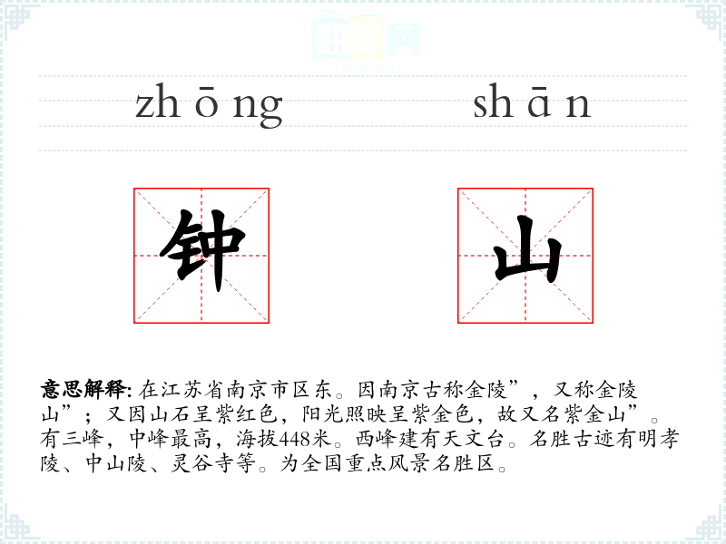 1.在江苏省南京市区东。因南京古称金陵”,又称金陵山”;又因山石呈紫红色,阳光照映呈紫金色,故又名紫金山”。有三峰,中峰最高,海拔448米。西峰建有天文台。名胜古迹有明孝陵、中山陵、灵谷寺等。为全国重点风景名胜区。