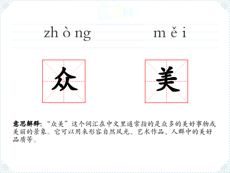 “众美”这个词汇丰富了我的语言表达,让我能够更生动地描述和分享美好的事物。在语言学*和表达中,它是一个非常有用的词汇,能够帮助我更准确地传达我对美好事物的感受和欣赏。