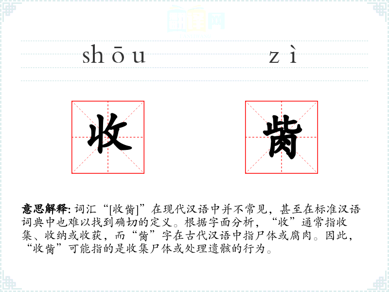 - 词源:“收”来自古代汉语,意为收集;“胔”也来自古代汉语,指尸体。
