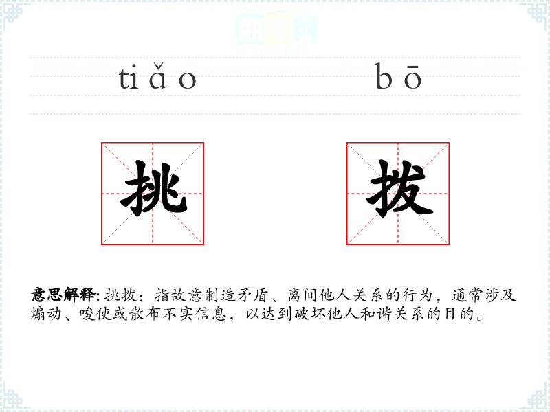 - 词源:挑拨一词由“挑”和“拨”两个动词组成,“挑”意为挑起、引发,“拨”意为拨动、搅动,合起来表示故意引发矛盾。