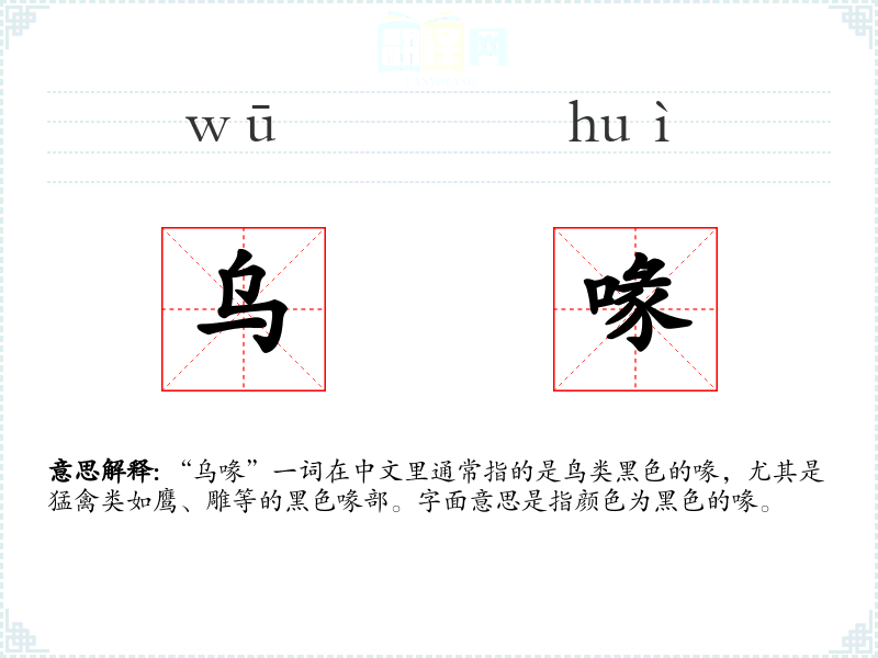 “乌喙”一词在中文里通常指的是鸟类黑色的喙,尤其是猛禽类如鹰、雕等的黑色喙部。字面意思是指颜色为黑色的喙。