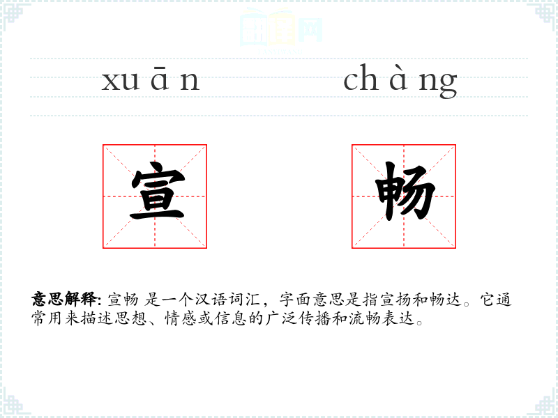 - 文学:在文学作品中,“宣畅”常用于描述人物的思想或情感的表达,如“他的理念宣畅四方”。