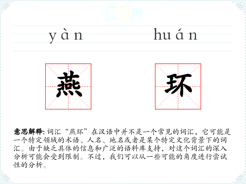 如果“燕环”是一个特定文化或历史背景下的词汇,了解其词源可能需要深入研究相关的历史文献或文化资料。
