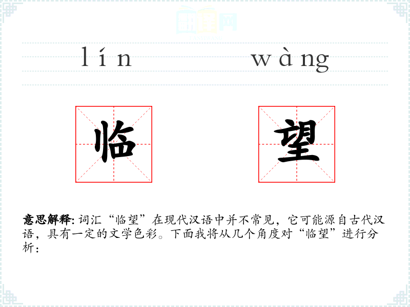 词汇“临望”在现代汉语中并不常见,它可能源自古代汉语,具有一定的文学色彩。下面我将从几个角度对“临望”进行分析: