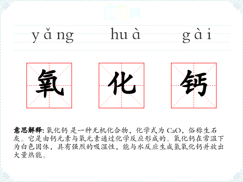 氧化钙作为一种化学物质,虽然在日常生活中不常直接接触,但其在建筑、农业和环境治理等领域的应用广泛。了解氧化钙的特性和用途,有助于更好地理解其在社会和工业中的重要性。在语言学*和表达中,掌握这类专业词汇可以丰富我们的知识储备,提高沟通的准确性和效率。