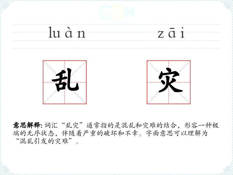 “乱灾”这个词可能是近代汉语中形成的,结合了“乱”和“灾”两个字的意义。在古代文献中,类似的表达可能通过组合不同的词汇来实现,如“乱世”、“灾祸”等。