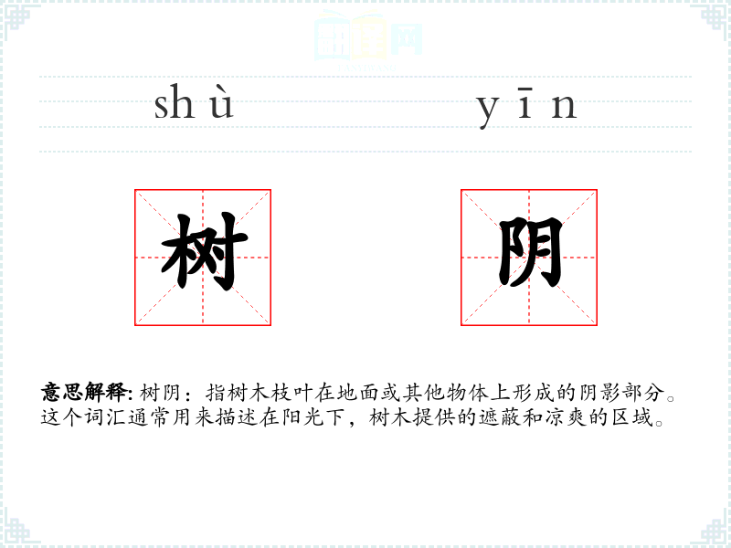 - 同义词:树荫、林荫、阴凉处