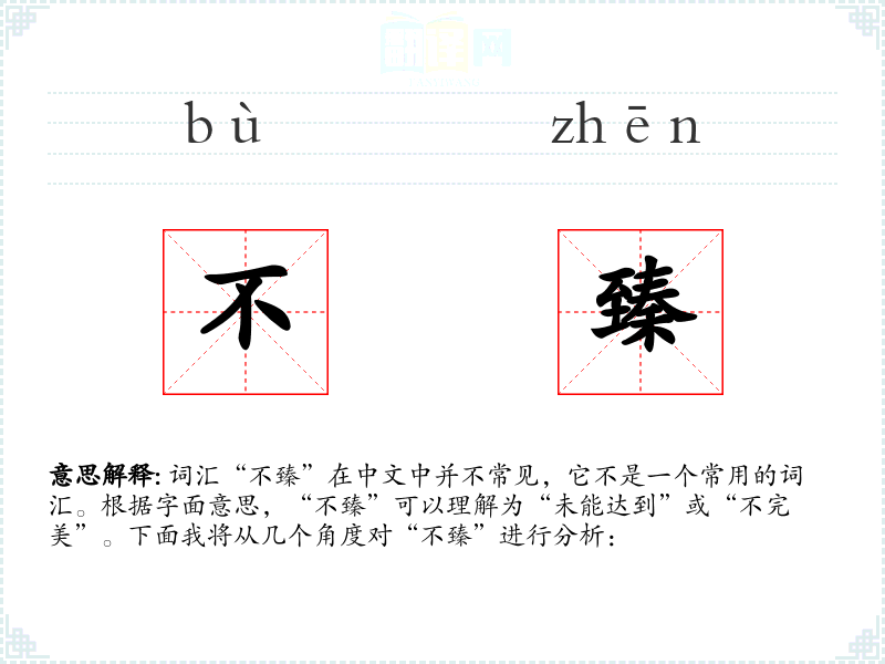 “不臻”由两个汉字组成:“不”表示否定,“臻”表示达到、完善。因此,“不臻”的基本含义是指某事物未能达到预期的标准或完美的状态。