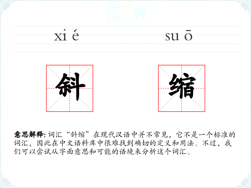 词汇“斜缩”在现代汉语中并不常见,它不是一个标准的词汇,因此在中文语料库中很难找到确切的定义和用法。不过,我们可以尝试从字面意思和可能的语境来分析这个词汇。